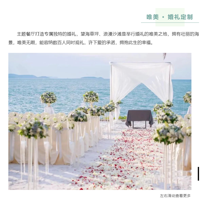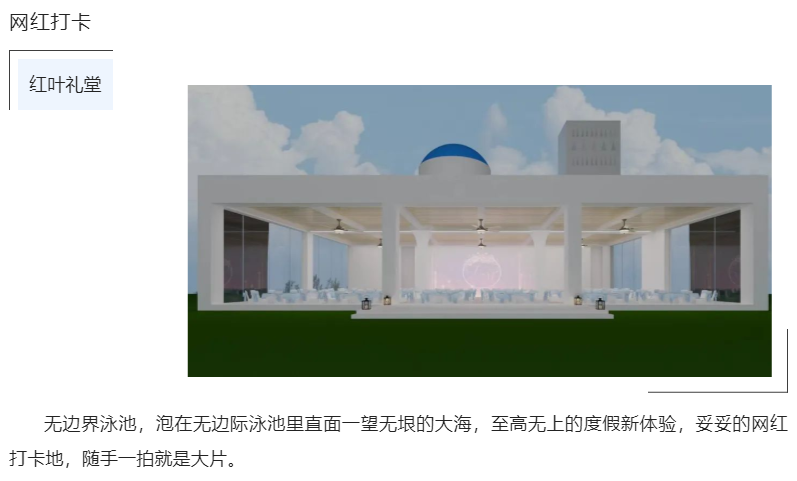 拥有网红打卡的永恒灯塔、红叶礼堂、草坪主题婚礼区、沙滩主题婚礼区;