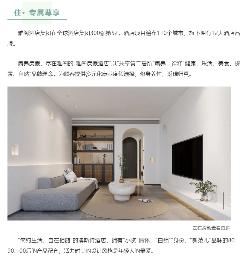 拥有全球酒店集团300强的雅阁酒店集团旗下的雅阁度假酒店、雅阁璞邸酒店、澳斯特酒店;