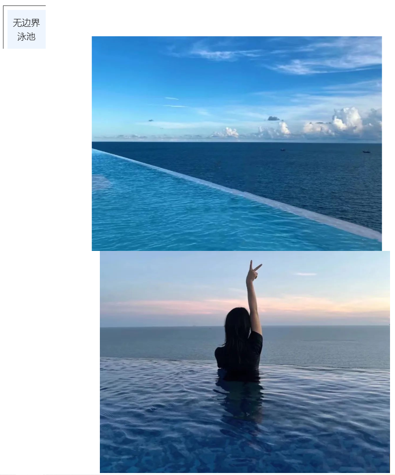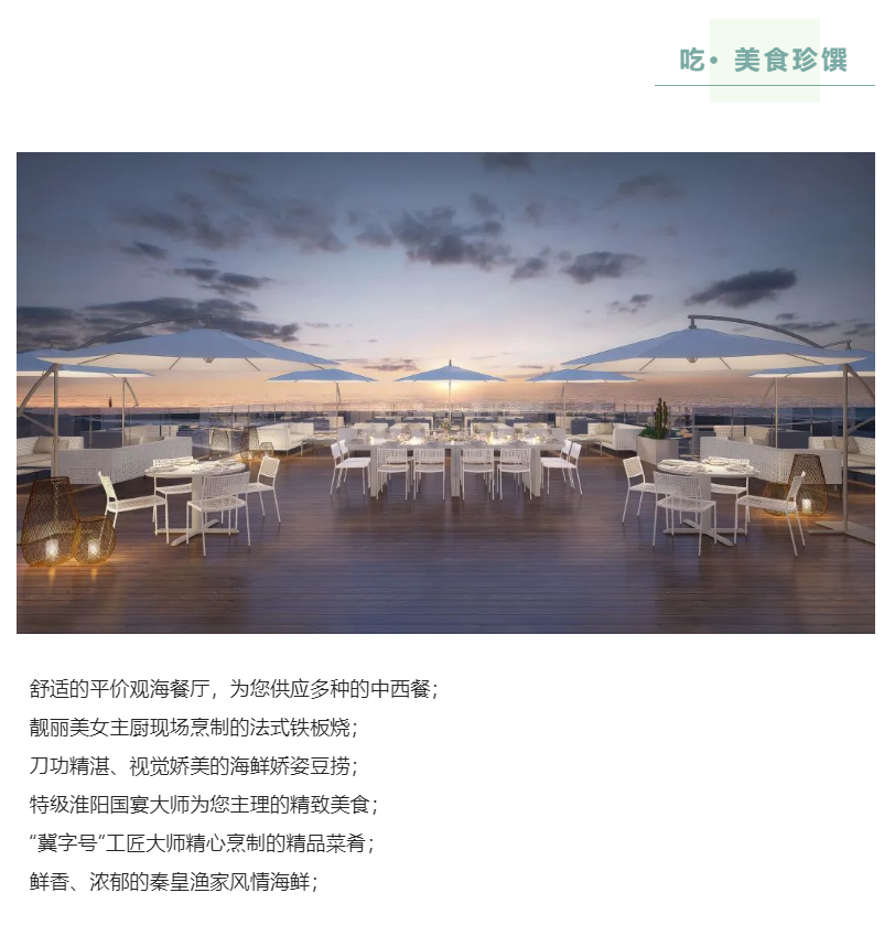 拥有海边百米内全方位看海呼吸海的菲拉海景酒店、日出餐厅、半点时光甜品站+星巴克;