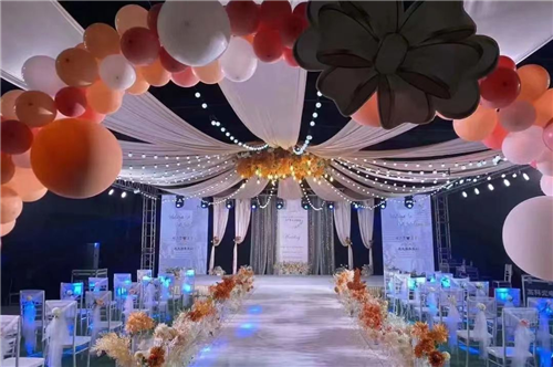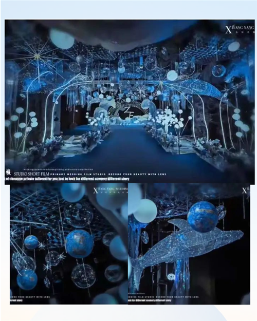本次婚宴以“星辰大海”为主题,婚礼采用海蓝色布局,代表着新人的爱情故事像星辰大海一样浪漫。