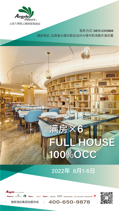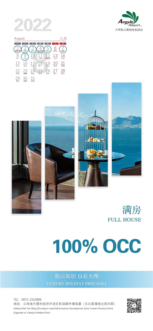 云南大理悦云雅阁度假酒店(雅阁酒店集团旗下成员酒店)勇夺8月雅阁酒店集团开门红,连续6天FULL HOUSE 100%OCC,7&8月的满房表现亮眼,广受市场消费者的欢迎与好评,是众多宾客来到云南旅途中美好的居停体验。