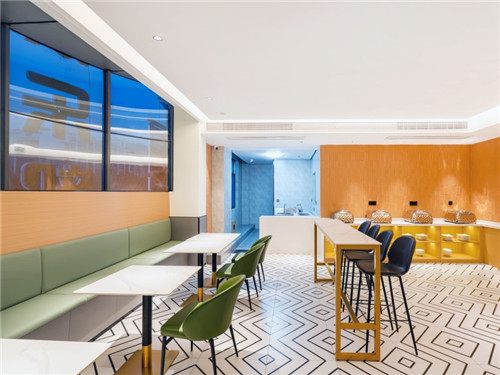大堂空间开阔,休闲区域给予宾客们舒适半包围式的墙柜、座位设置,再用黄橙和绿的色调营造出丰富的感情色彩,使等待时间、歇息时光尽可能地令人愉悦。