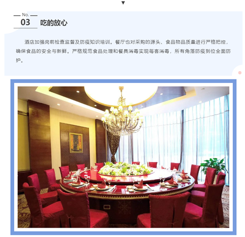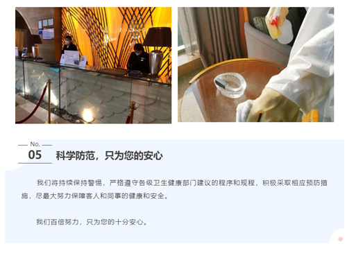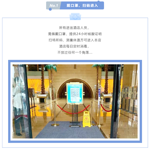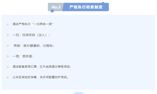 全面推进、重点督查“一扫两核一测”疫情防控措施,无24小时核酸检测报告无法办理入住手续。构筑全方位、无死角的防护墙,为您的健康平安保驾护航。让您住得安心,吃得放心,玩得开心。
