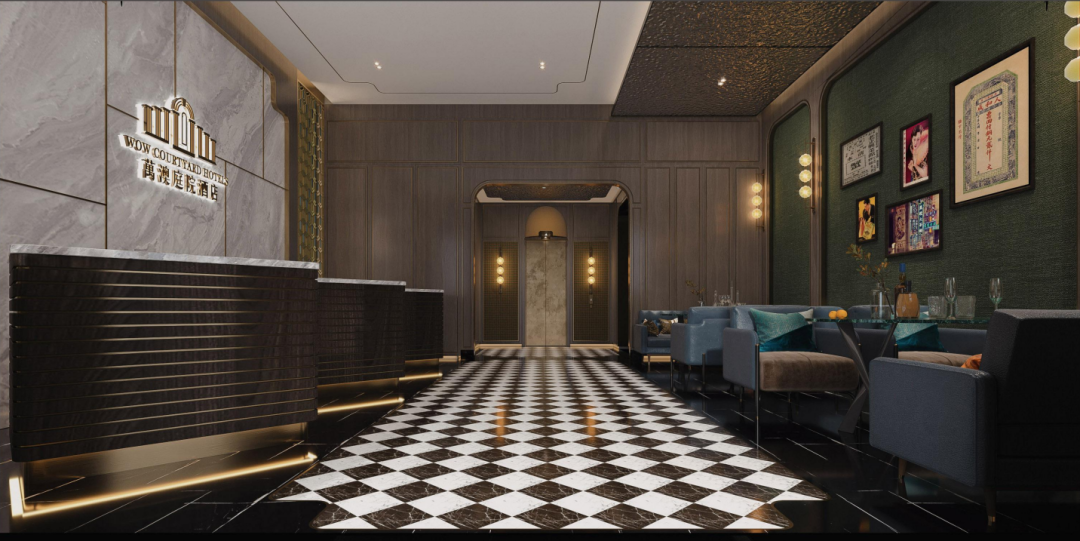 大厅搭配祖母绿、胡桃木色,以典雅的孔雀蓝作为衬托,展现出复古的民国气息,花纹地板与温润的空间质感融为一体。