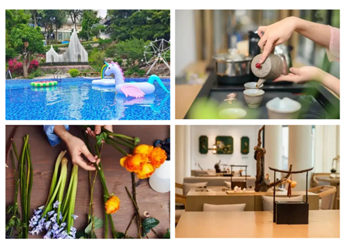 抄写佛经、细品茗茶、畅游竹林泳池