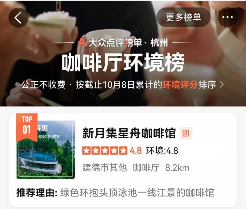 新月集星舟咖啡馆更进入大众点评杭州咖啡厅环境榜第一名