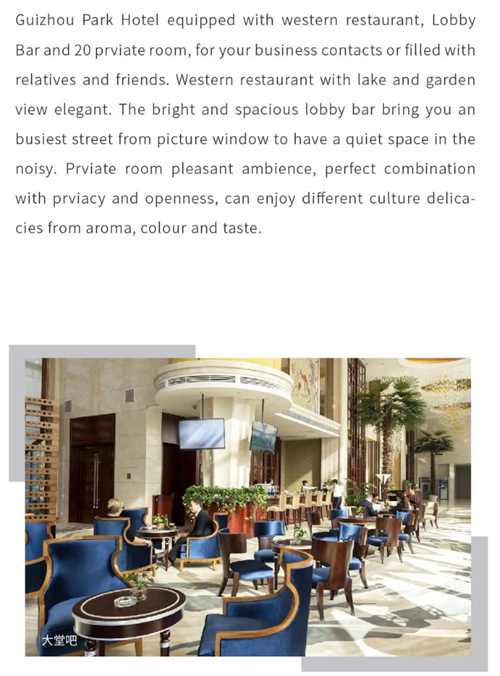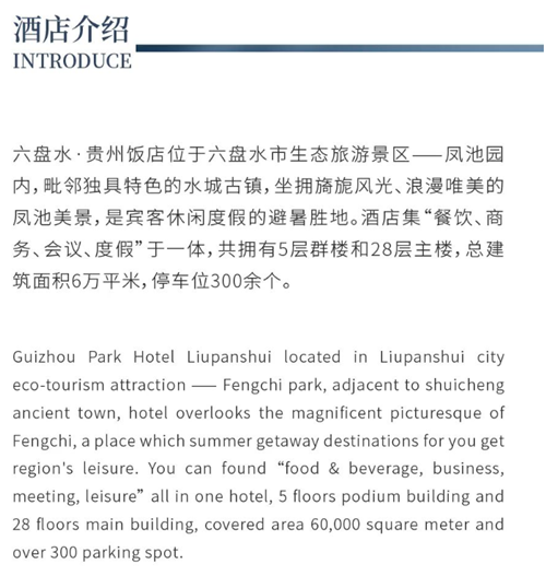 贵州酒店集团雅阁大酒店(雅阁酒店集团旗下成员酒店)位于六盘水市生态旅游景区凤池园内,毗邻水城古镇,坐拥旖旎风光,离历史悠久,风景清幽的水城湖畔仅一步之遥;各式珍馐美食让宾客全方位品味中、西饮食文化及“黔菜”精粹。