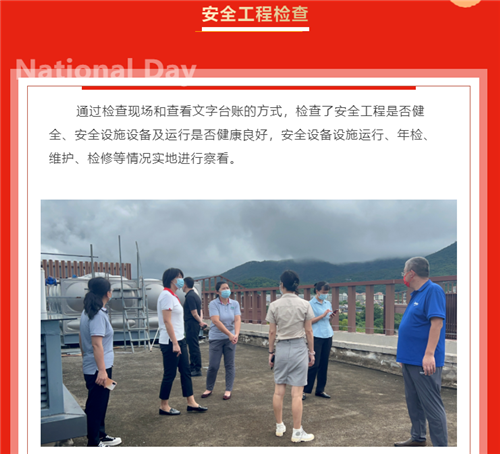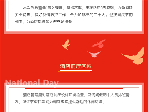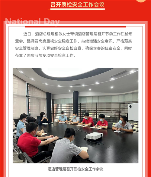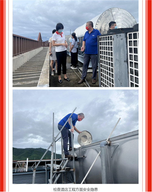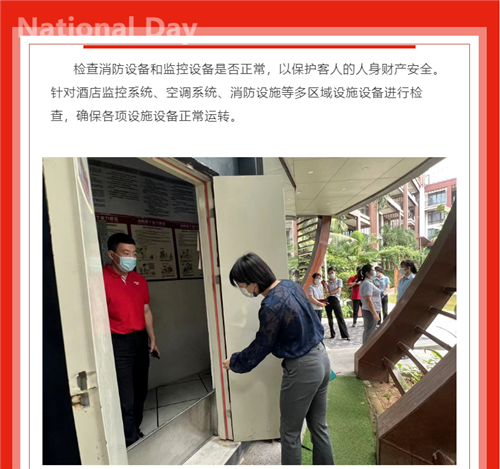 严质检·保安全·迎国庆,在国庆佳节到来之际,三亚亚龙湾雅阁温泉度假酒店(雅阁酒店集团旗下成员酒店)对酒店的安全生产,疫情防控等工作进行节前检查。