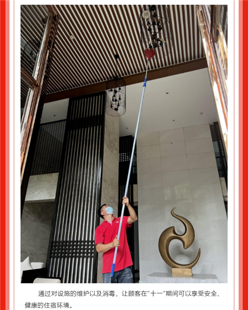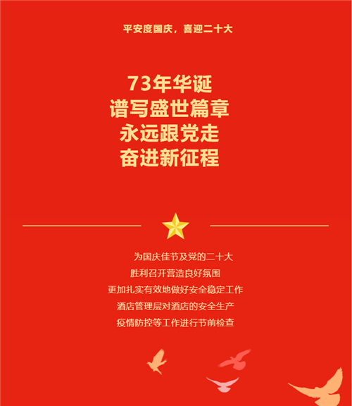 祝愿祖国,繁荣昌盛,三亚亚龙湾雅阁温泉度假酒店(雅阁酒店集团旗下成员酒店)人员在做好个人防护的同时,提醒客人佩戴口罩、落实测温、扫码、线上预约、一米线、消杀等防控措施。切实做到自律、严格按照疫情防控和安全生产工作的各项管理措施开展经营活动。