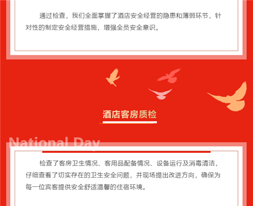 安全工作,是宾客享受酒店品质的基础,保障服务和卫生质量打造酒店品牌的根本。通过此次检查进一步增强了各部门安全、卫生和服务意识,为国庆假期的接待工作提供了强有力保障。