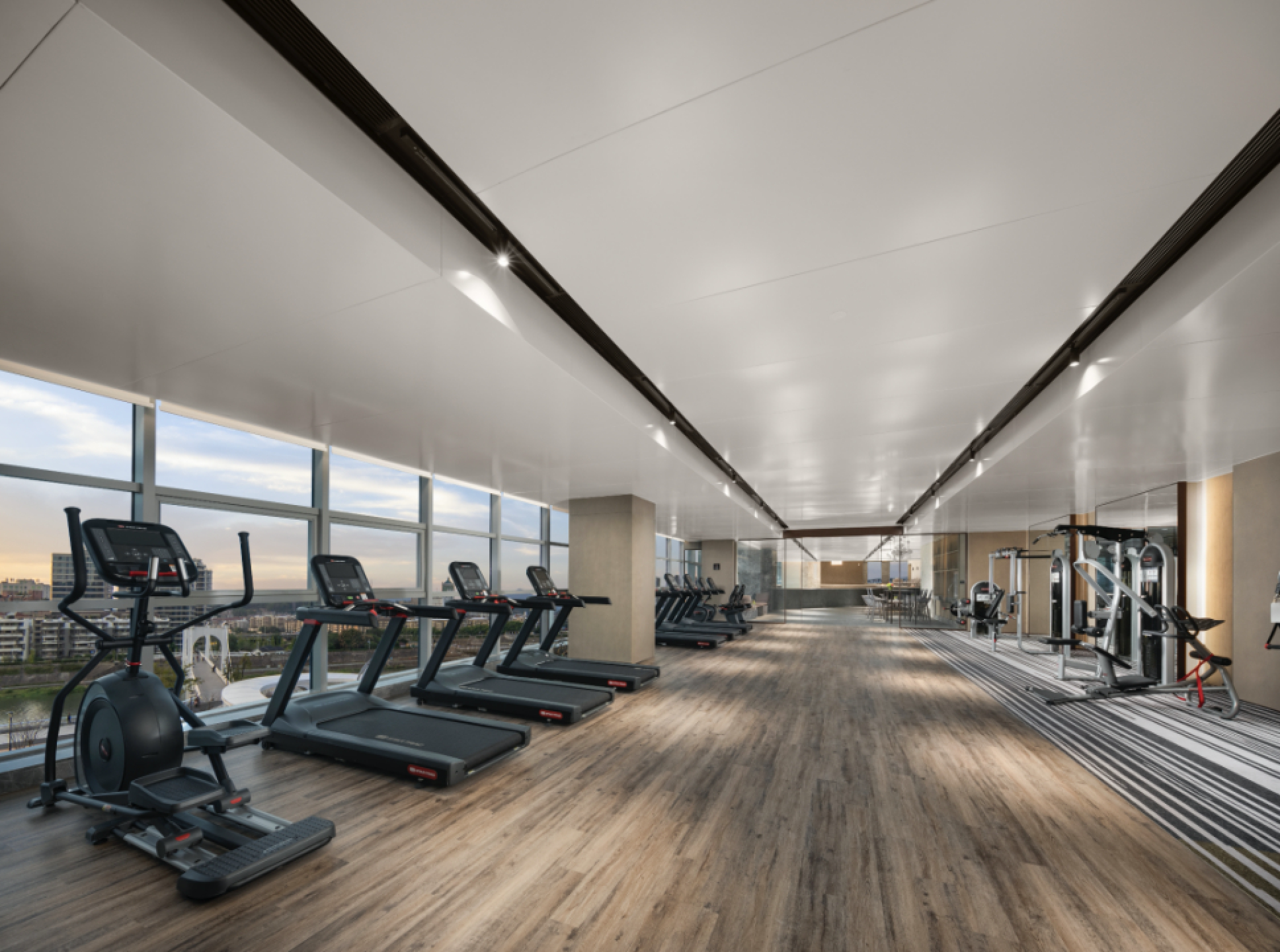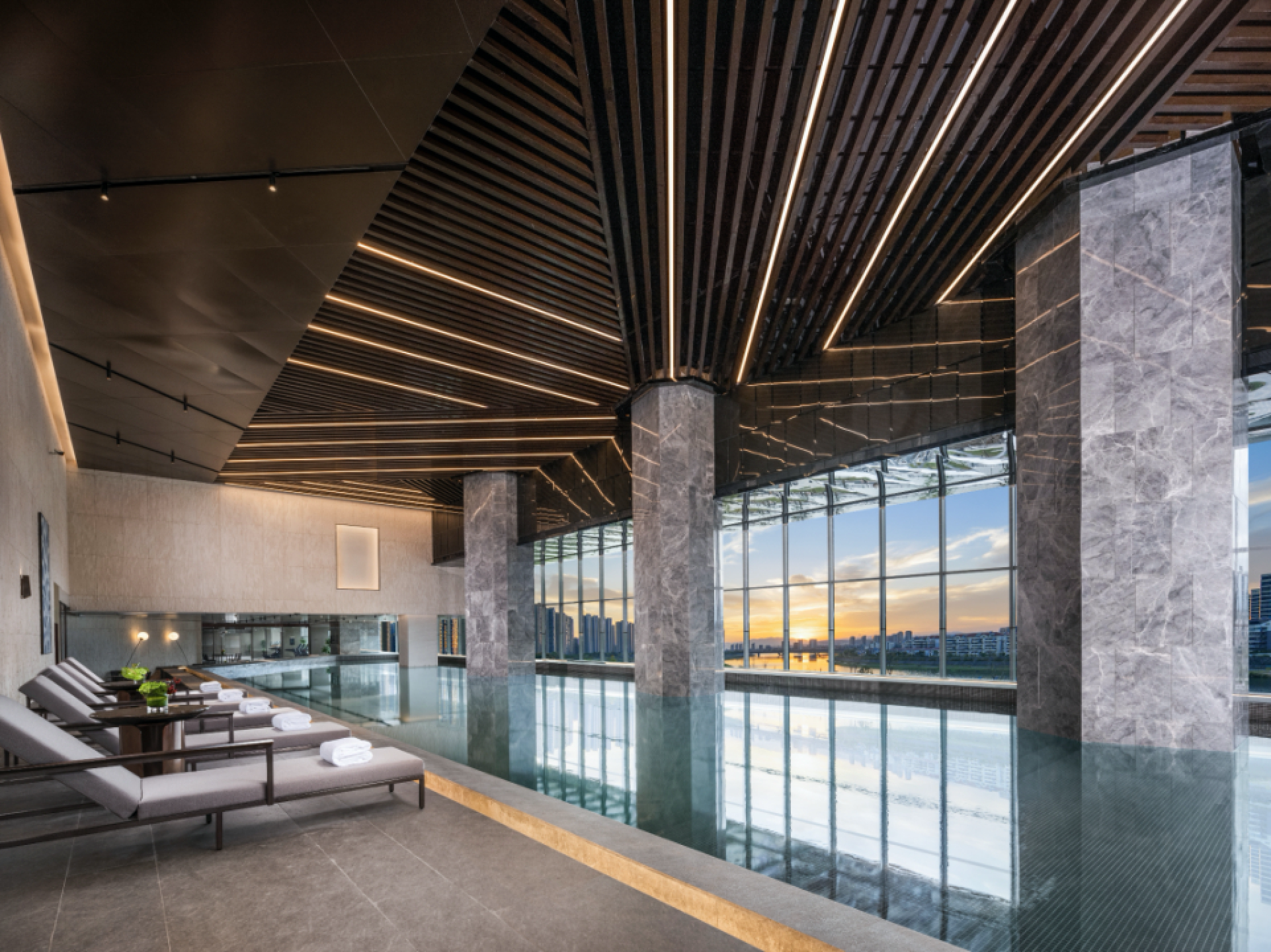 康体区域设置有游泳池、健身房、瑜伽室、休息室、棋牌室、儿童游乐园等功能区域,通过空间边界的融合,打破传统酒店康体区域的单一定义及形式束缚,创造适应多类人群开放与多元互动的空间体验。