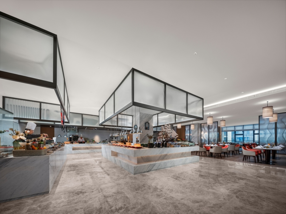 位于四楼的地中海咖啡厅和四季轩中餐厅为宾客提供各式山海珍馐,可同时容纳180余位用餐的地中海咖啡厅以天然石材的肌理、原木的温暖质感及汲取当地山水元素的纱帘设计,营造廊桥外惬意景致的氛围,为宾客提供世界风味美食、各类自助主题盛宴、健康营养套餐以及送餐服务;四季轩中餐厅设有国风堂各式豪华包厢8个,荟萃精品瓯菜、江浙菜、经典粤菜等,星厨精选有机食材,精心烹制各式时令珍馐与创意美食,为宾客带来浓郁的风情美味。
