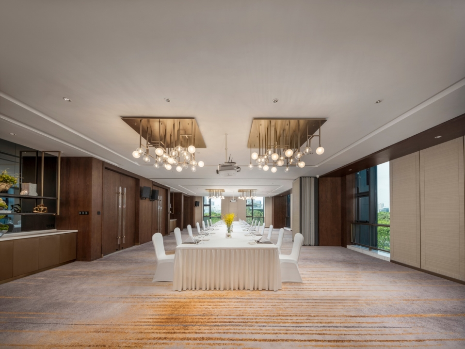酒店共拥有超3000平方米的会议空间,其中1200平方米、高8米的无柱式宴会厅最多可容纳1000人,还可分拆成两个独立区域。另外50至600平方米不等的2个多功能厅及5个标准会议室为各种规模的会议、活动、婚宴提供灵活多变的空间和宽敞的厅外休憩区域。