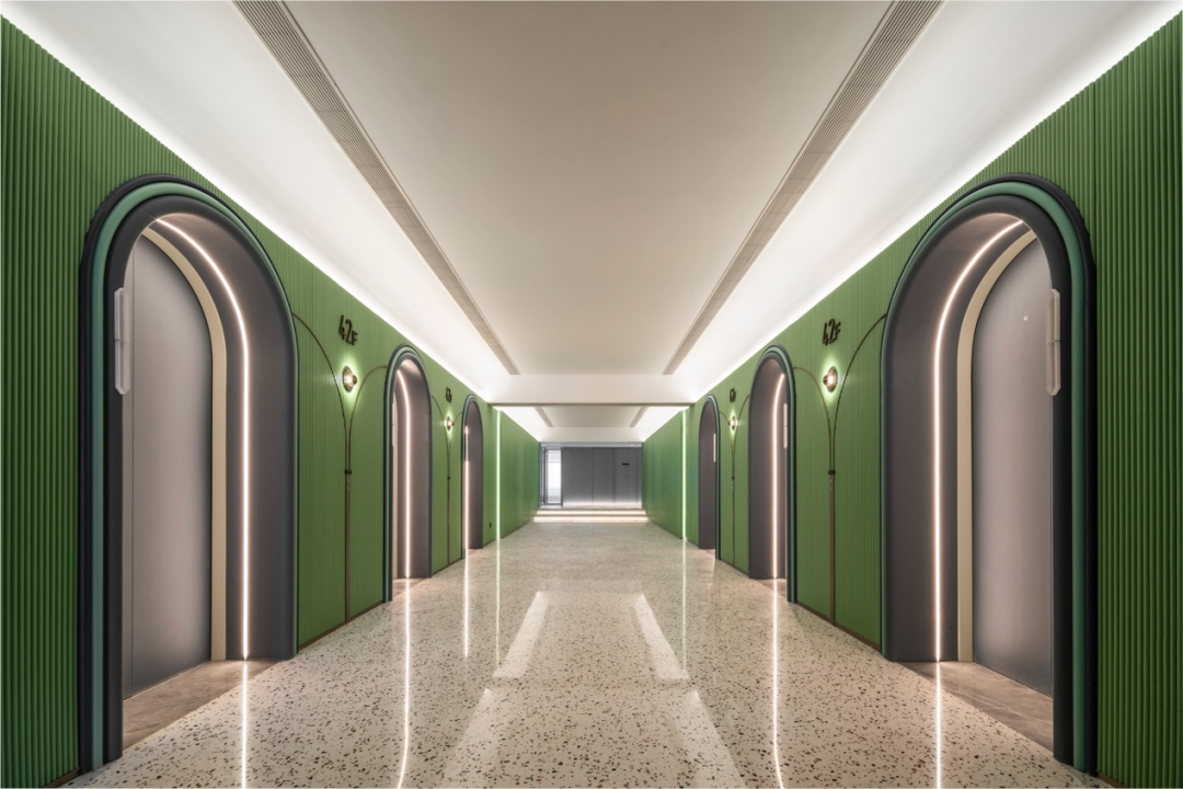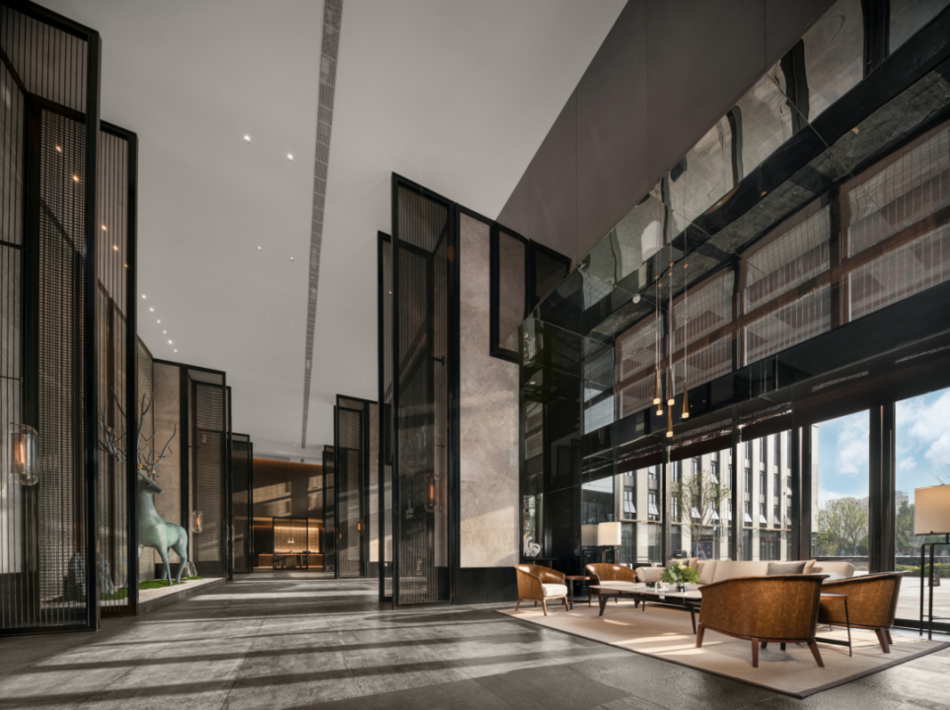 从廊桥内部吸取结构概念,酒店大堂空间以国际化手法建立对称框架造型,延伸空间线条,加深视觉感染力,空间以驼色、深灰色做为主色调,突显内敛奢华感;材质上利用金属、皮革、石材的天然质感,创造简约却不失奢华质感的温暖体验。