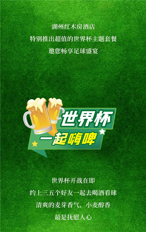 世界杯一起嗨啤,欢乐尽在浙江湖州红木房雅阁璞邸酒店(雅阁酒店集团旗下成员酒店)。