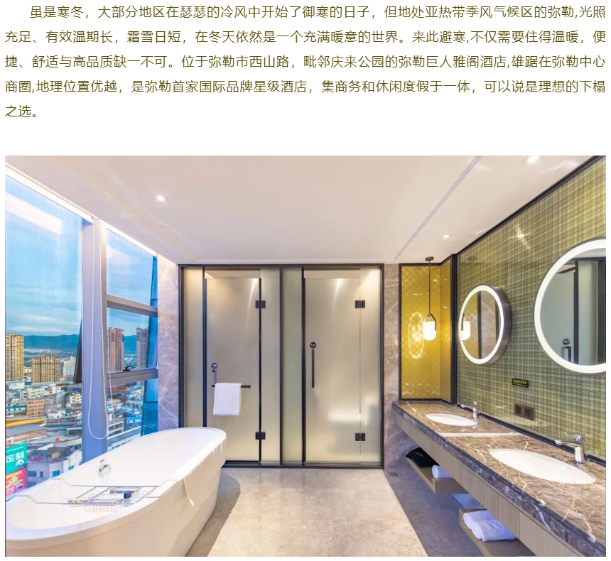 弥勒,一座在安静祥和气息中不失都市繁华的城市。位于弥勒市西山路,毗邻庆来公园的云南弥勒巨人雅阁酒店(雅阁酒店集团旗下成员酒店),雄踞在弥勒中心商圈,地理位置优越,是弥勒首家国际品牌星级酒店,集商务和休闲度假于一体,可以说是理想的下榻之选。