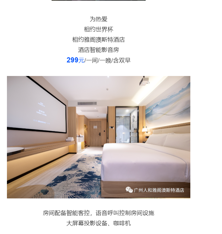 广州人和雅阁澳斯特酒店(雅阁酒店集团旗下成员酒店)世界杯期间,为您提供酒店智能影音房,房间配备智能客控,语音呼叫控制房间设施。