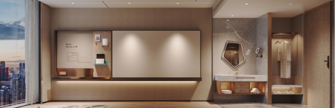 除此之外,商务房型还新增了多功能组合墙,商务客人不仅可实现临时会议、办公记录,还有书籍可供借阅,轻便快捷。
