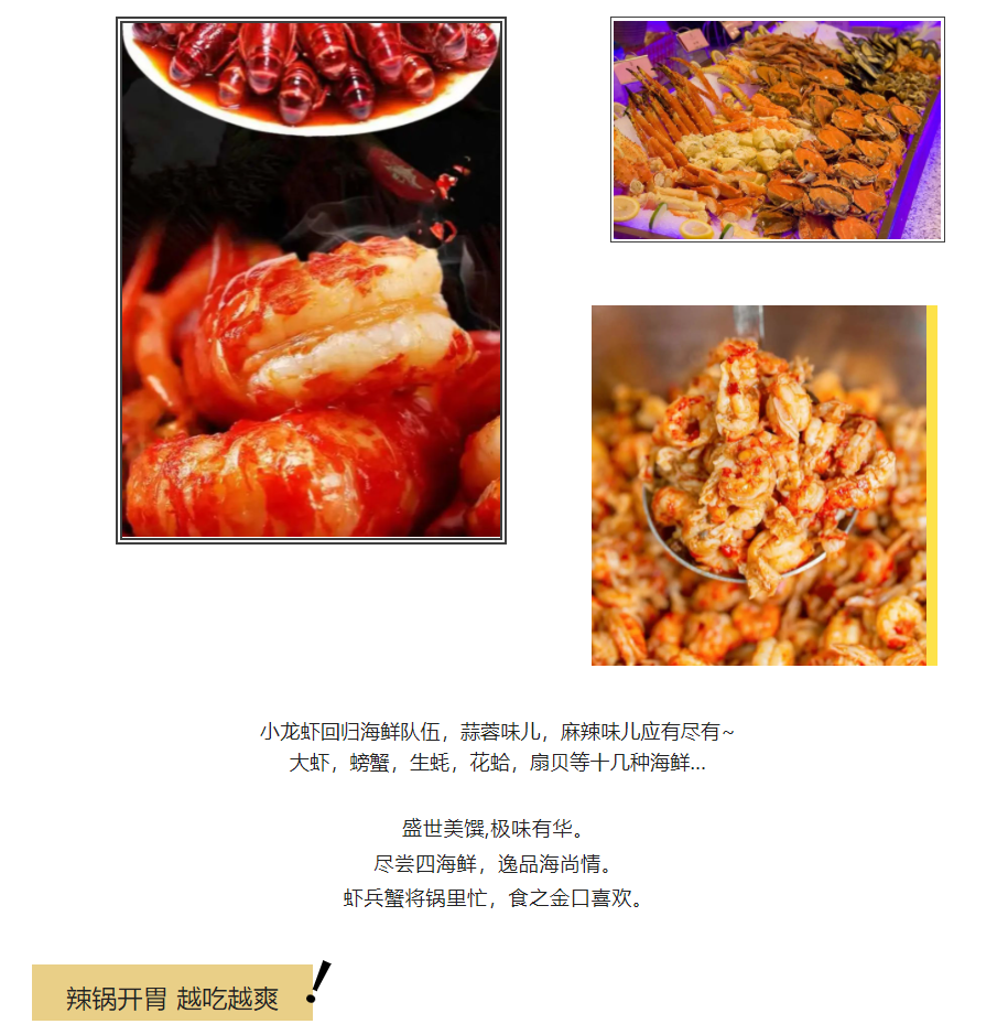 升级海鲜大咖:小龙虾,螃蟹,生蚝,花蛤,扇贝等十几种海鲜,视觉盛宴拉满