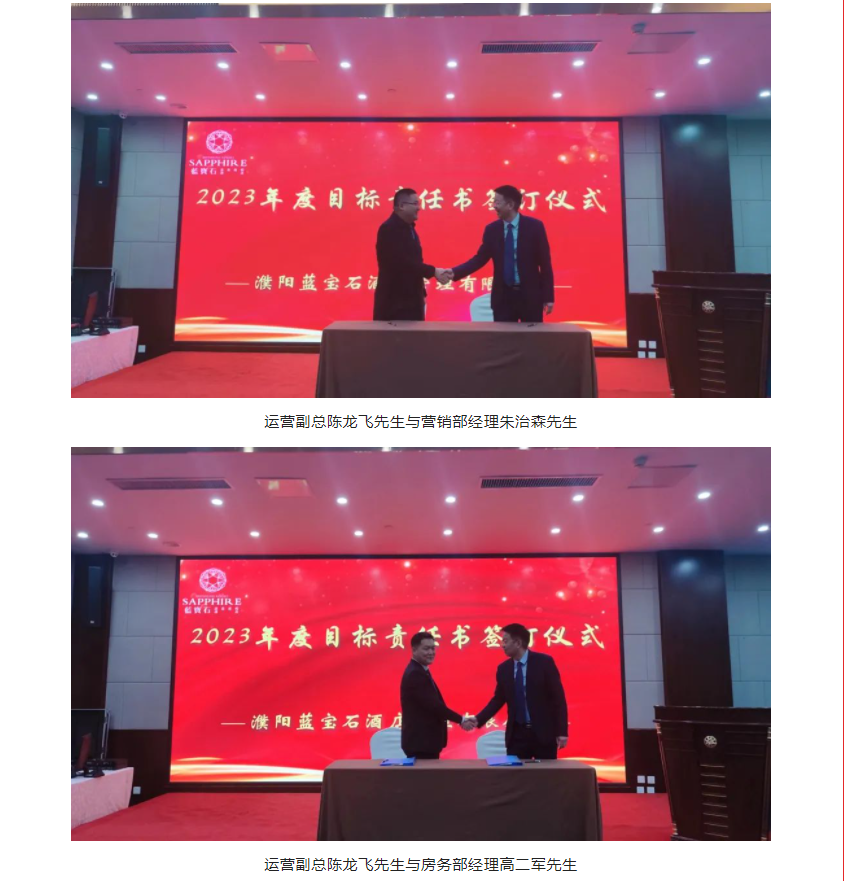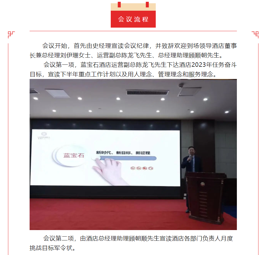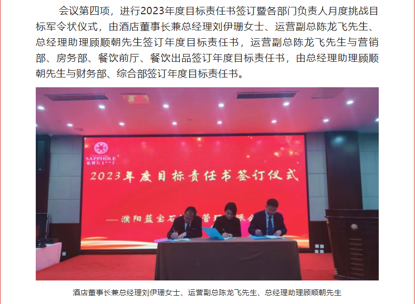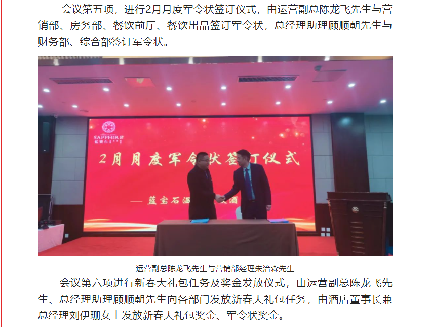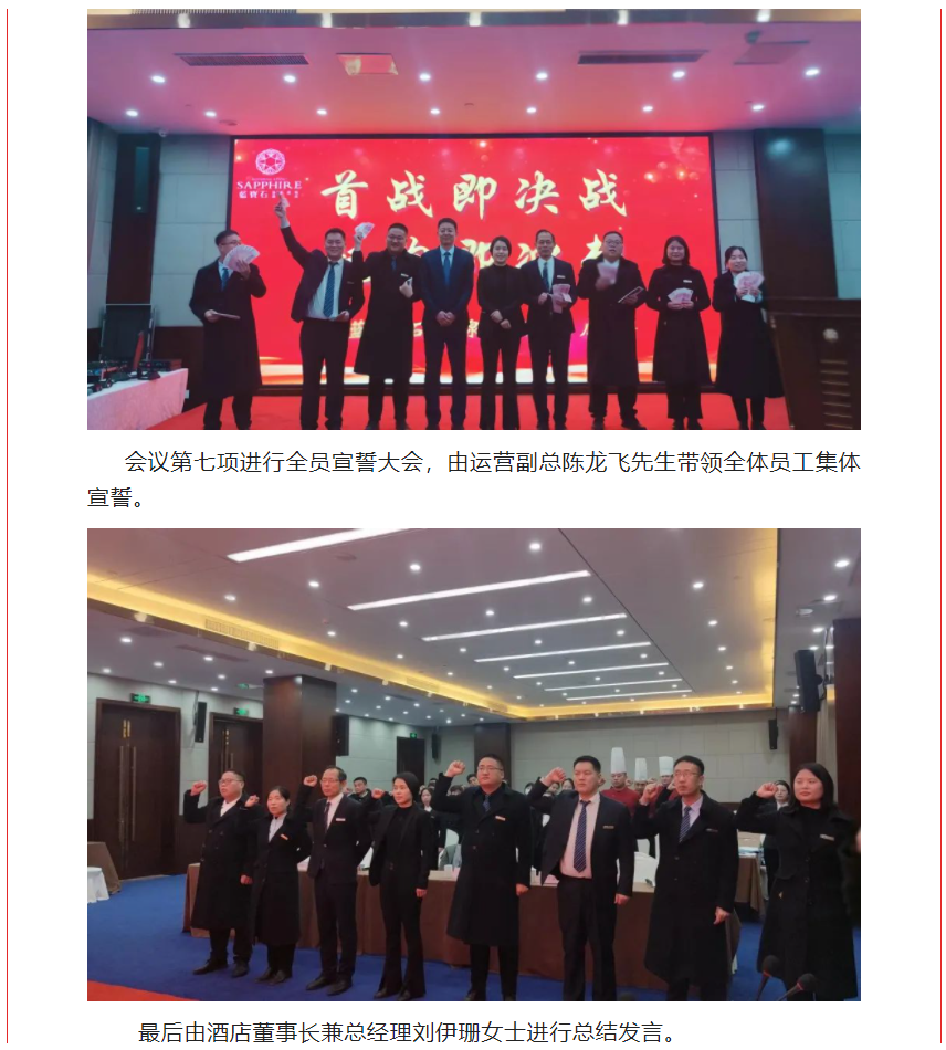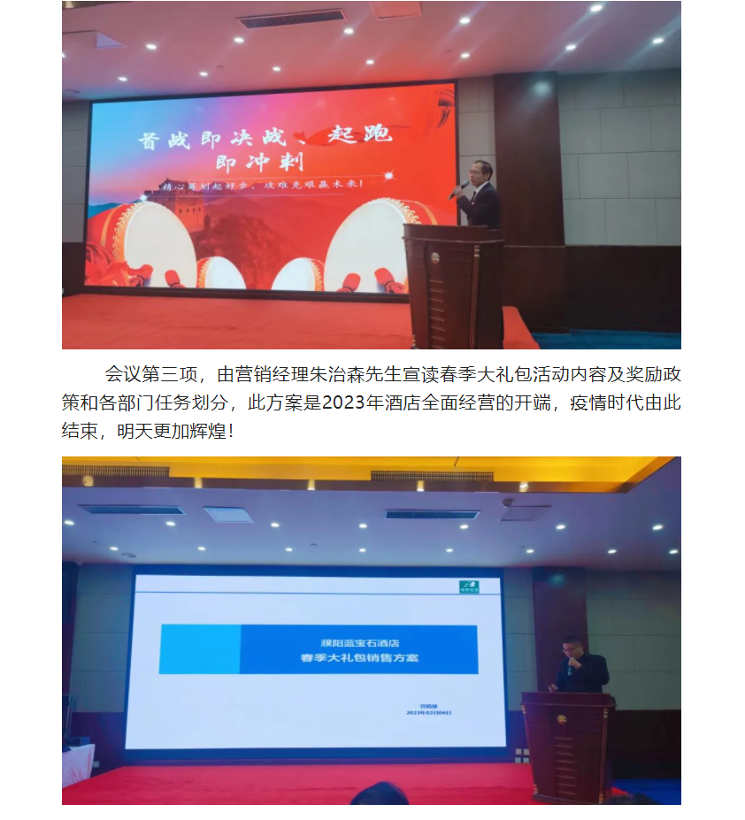 2023年2月7日上午,河南濮阳申泰雅阁温泉度假酒店(雅阁酒店集团旗下成员酒店)员工大会在酒店申龙厅顺利召开。蓝宝石温泉度假酒店领导、各部门负责人,及酒店全体员工参加了会议。本次会议的主题为“首战即决战 起跑即冲刺”,首战决定全局,起跑关乎后势。2023年是酒店营销年,也是改革之年,是继三年疫情之后全面发展、撸起袖子加油干的一年。会议由酒店综合部经理史慧星女士主持。