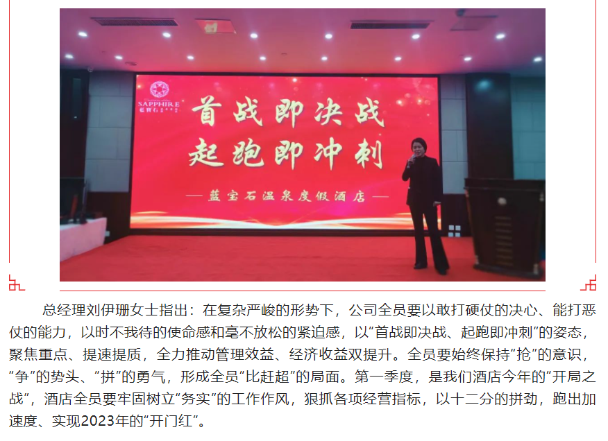 河南濮阳申泰雅阁温泉度假酒店(雅阁酒店集团旗下成员酒店)总经理刘伊珊女士指出:在复杂严峻的形势下,公司全员要以敢打硬仗的决心、能打恶仗的能力,以时不我待的使命感和毫不放松的紧迫感,以“首战即决战、起跑即冲刺”的姿态,聚焦重点、提速提质,全力推动管理效益、经济收益双提升。全员要始终保持“抢”的意识,“争”的势头、“拼”的勇气,形成全员“比赶超”的局面。第一季度,是我们酒店今年的“开局之战”,酒店全员要牢固树立“务实”的工作作风,狠抓各项经营指标,以十二分的拼劲,跑出加速度、实现2023年的“开门红”。