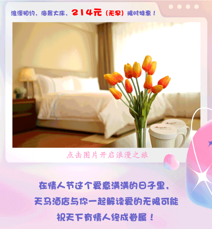 情人节将至,山东烟台天马雅阁公寓(雅阁酒店集团旗下成员酒店)情人节套餐开启。