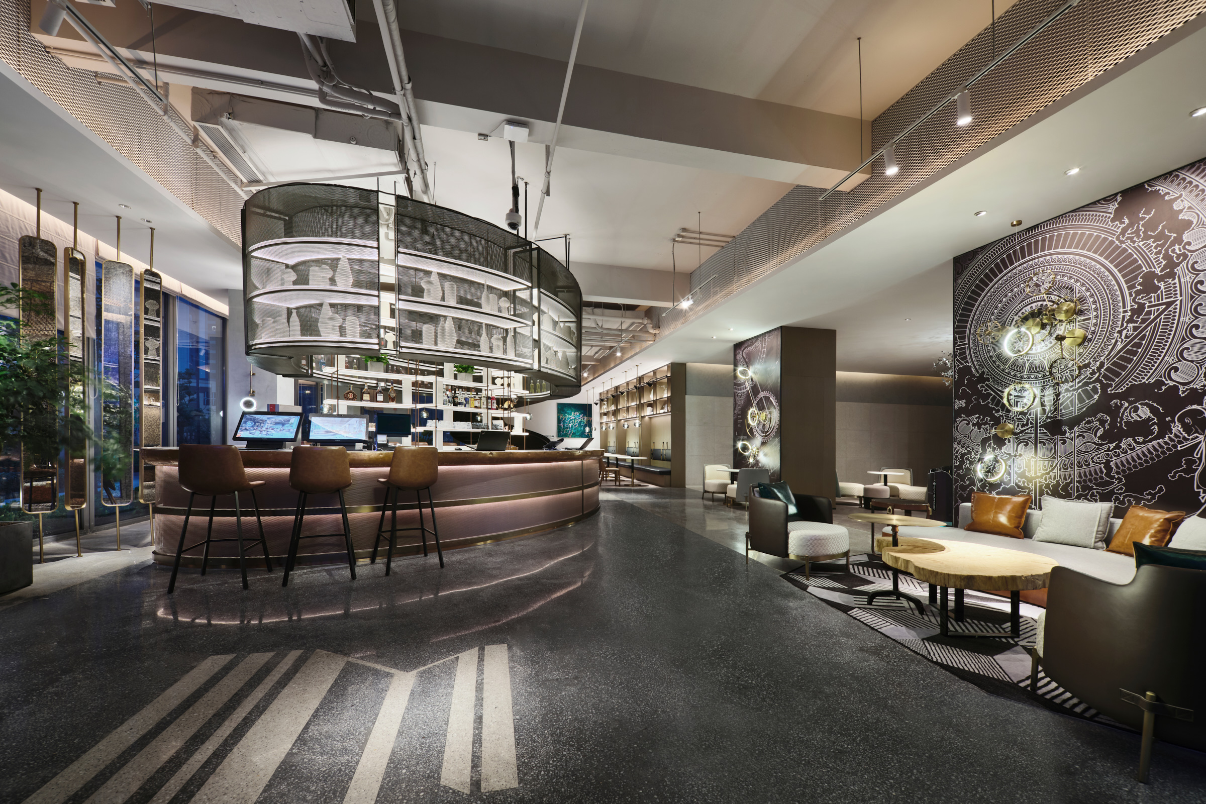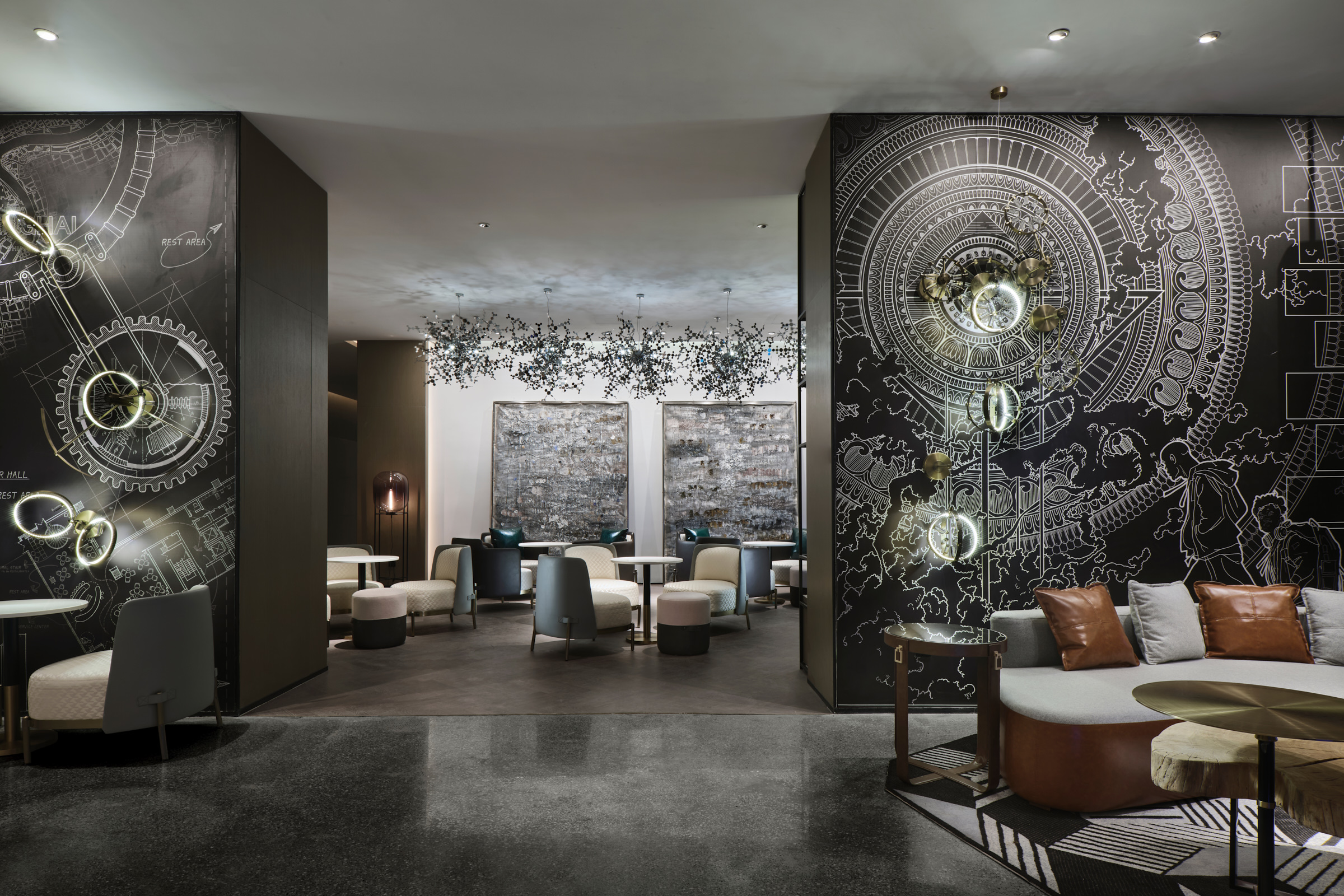 上海青浦万达美华酒店室内主打轻工业风格,整体色调以内敛低纯度灰色系和金属色为主,局部点缀亮丽纯色以打破硬朗感觉,充满潮流设计元素。来自当代新锐艺术家的绘画、雕塑、新媒体装置艺术品更为酒店增添了艺术气息,让人流连忘返。