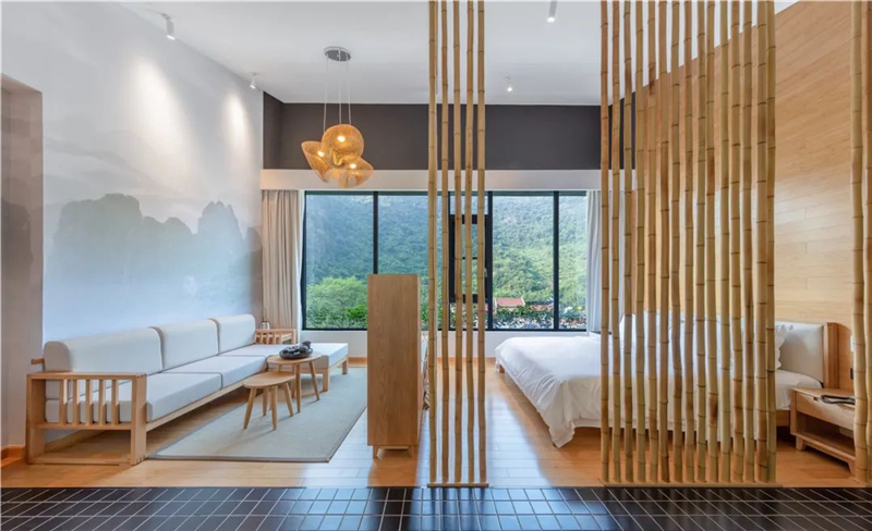 广东清远璞驿澳斯特WOW酒店(雅阁酒店集团旗下成员酒店)坐落于清远市黄花镇,是清远首家以竹为主题的生态精品酒店。酒店以竹色构建绿色环保的空间,从顶面到地面家居都由错落的竹竿装置而成,感受竹文化带来宁静清幽的世外桃源。