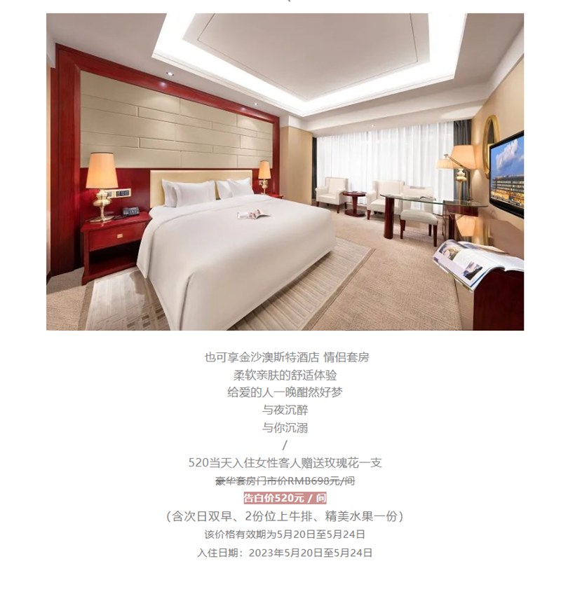 雅阁酒店集团|『浪漫五月』金沙澳斯特酒店豪华套房