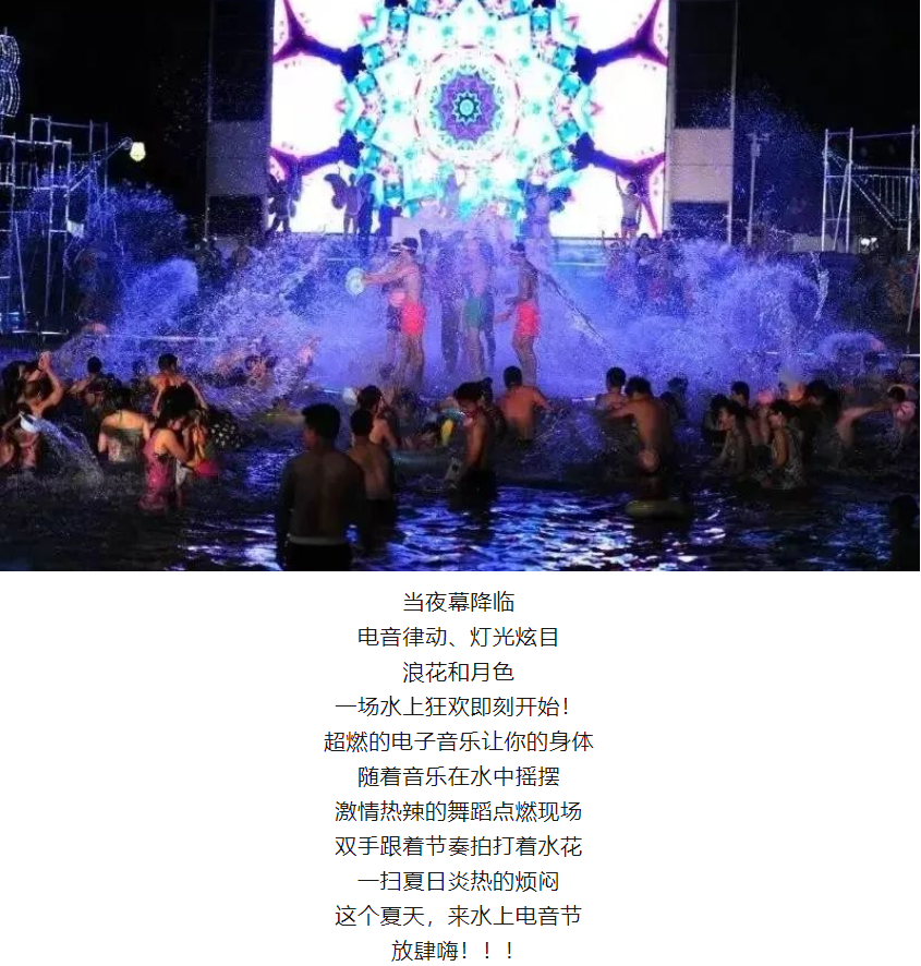 河南濮阳申泰雅阁温泉度假酒店(雅阁酒店集团旗下成员酒店)所在蓝宝石水世界,7月1日夜场盛大开放。夜场开放时间:17:30-21:00。夏日激情,从蓝宝石水世界水上电音节开始,电音的节奏与心跳同步,拍打的浪花是夏日的狂欢,水上电音节回归,点燃这个夏天,一起嗨起来!