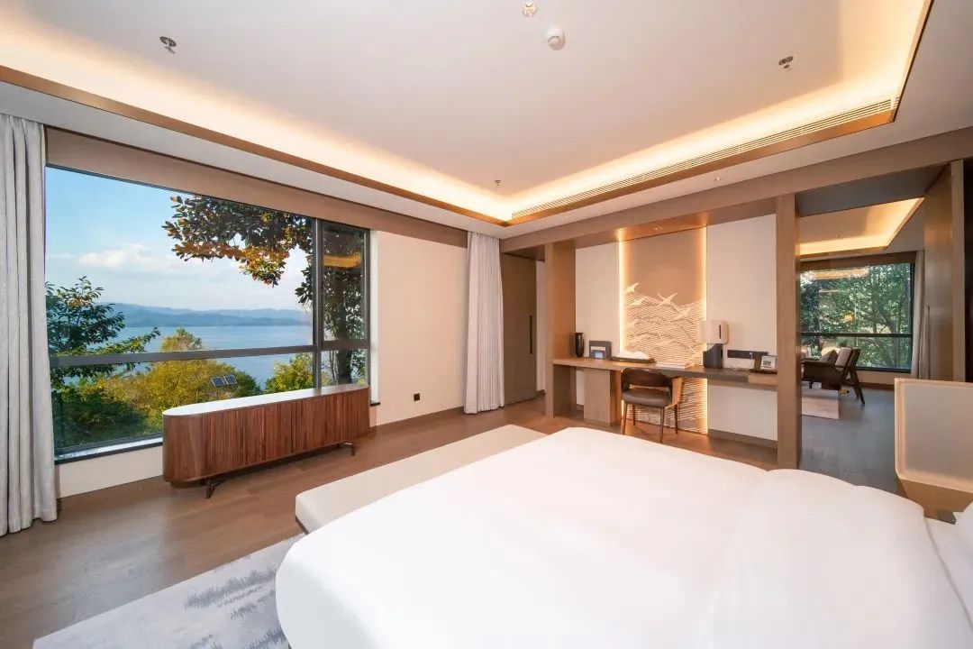每日以秀水美景为伴,依群山为枕,着碧水为被。酒店共有客房302间,每个房间都设有独立的景观阳台,宾客可以凭栏远眺,透过房内的超大窗户,飞鸟渔船、植被湖泊,与山水之间,看尽碧水苍山。