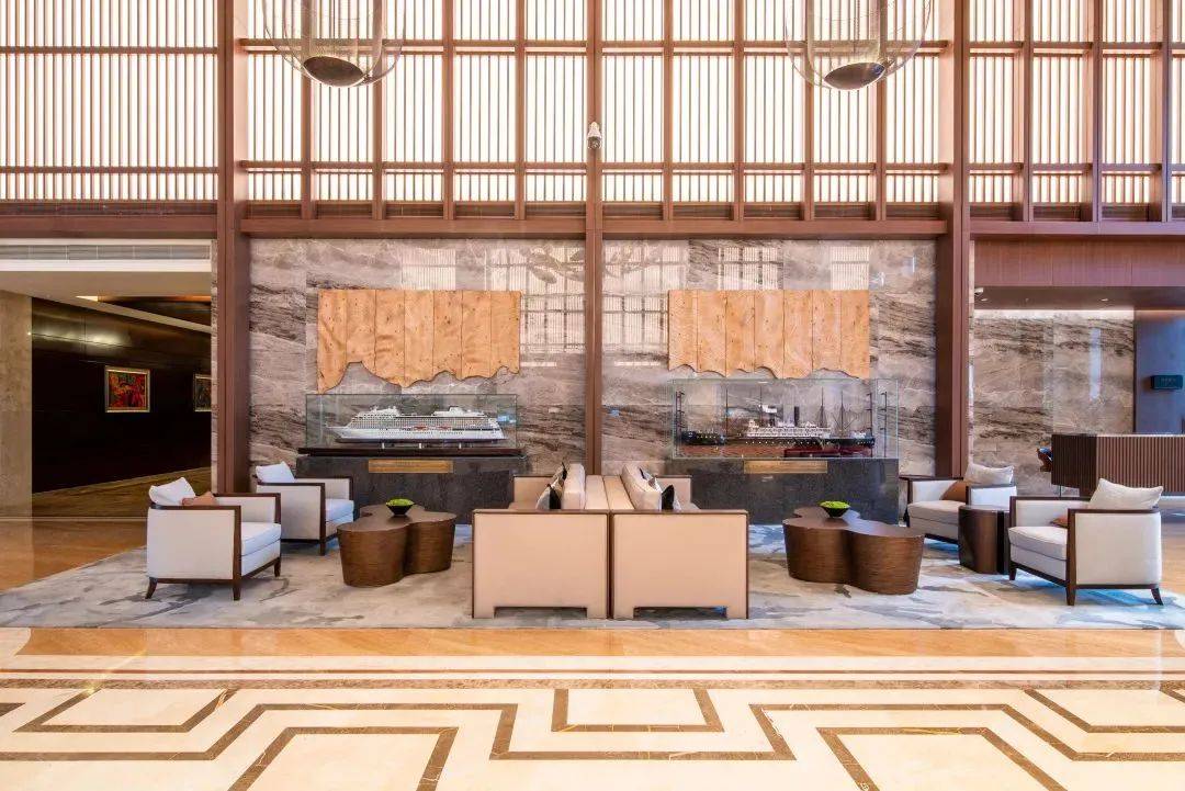 大堂中央采用的拱形天棚,迎接着阳光的播洒,垂悬在天棚中央的鱼群与招商局“双鱼旗”寓意巧妙结合,仿佛会随着宾客的脚步恣意遨游,欢欣跳跃,吸引宾客驻足观看。大堂艺术品也处处体现了“鱼”的概念,其中大堂吧摆放的艺术品,宛如鱼跃水面摇摆的鱼尾,灵动活泼。
