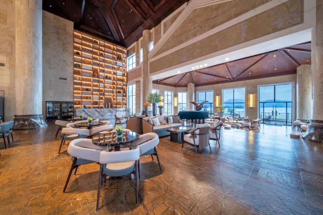 酒店大堂以咖色、纯色调和简洁的线条设计为主,融入千岛湖的水乡情、鱼文化,既不失新中式的文化韵味和底蕴,又尽显现代时尚的简约舒适,别具一格中显露尊贵、典雅浸透豪华的设计哲学,彰显出酒店的独特性和多元化风格。