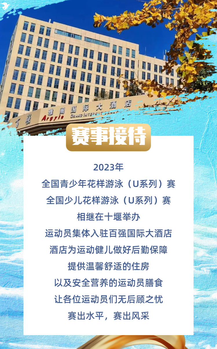 “水上芭蕾”叩动百强心扉,2023年全国青少年花样游泳 (U系列) 赛全国少儿花样游泳 (U系列) 赛相继在十堰举办运动员集体入驻湖北十堰世纪百强武当雅阁国际大酒店(雅阁酒店集团旗下成员酒店)。