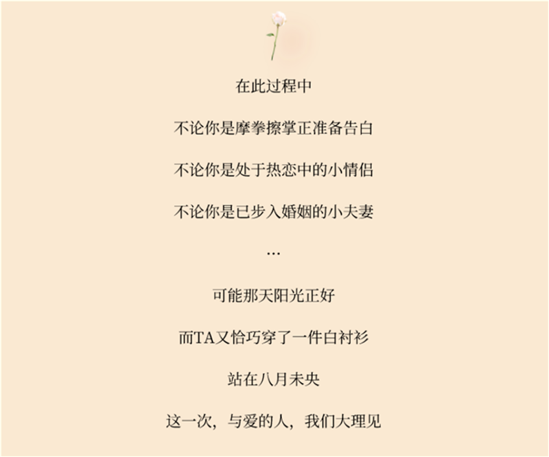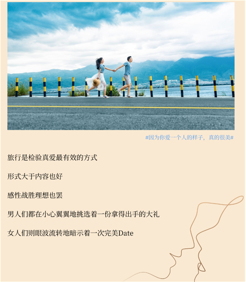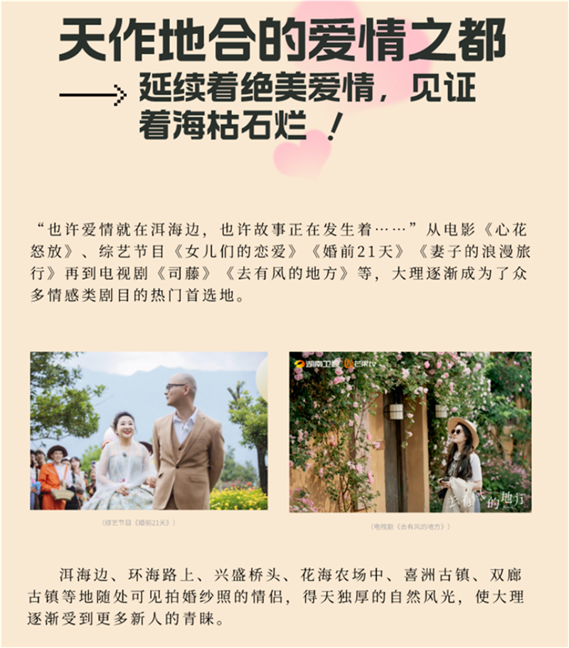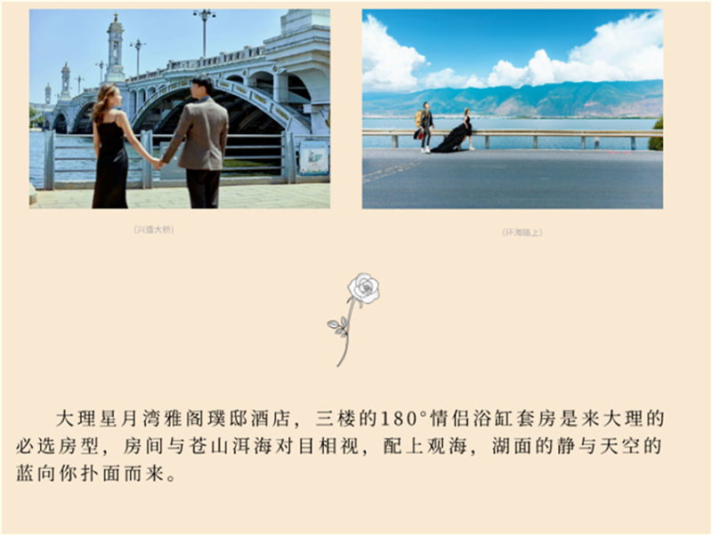 大理星月湾雅阁璞邸酒店(雅阁酒店集团旗下成员酒店)浪漫情侣礼遇,洱海边、环海路上、兴盛桥头、花海农场中、喜洲古镇、双廊古镇等地随处可见拍婚纱照的情侣,得天独厚的自然风光,使大理逐渐受到更多新人的青睐。