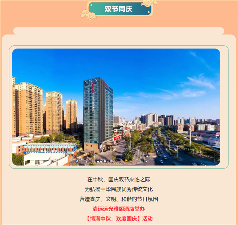 浓情金秋庆团圆,月满华诞迎国庆,清远远光雅阁酒店(雅阁酒店集团旗下成员酒店)与您共赴美好之约。