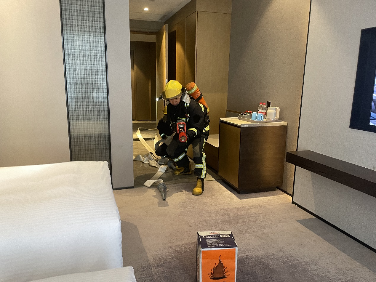 当天下午,酒店模拟演练客房突发“火灾”,酒店随即启动应急处置程序。酒店内部微型消防人员第一时间赶到现场对初期火灾进行扑救,同时开展被困人员疏散工作,并立即拨打119报警电话请求支援。火灾现场模拟出现人员受伤,,对伤员进行急救,消防演练有序开展。
