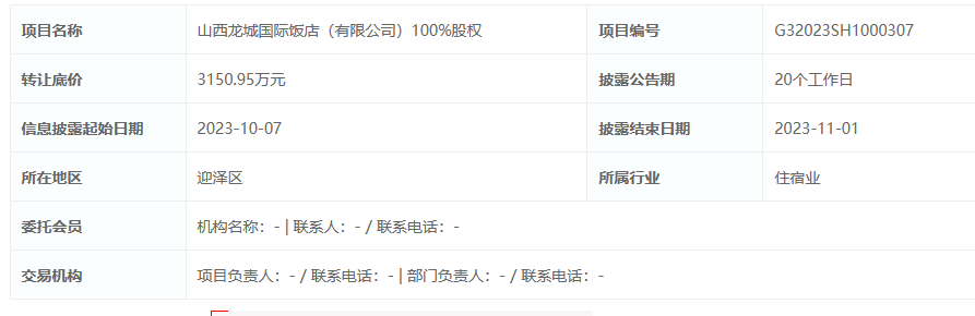据全国产权交易中心,北京中邮资产管理有限公司底价3150.95万元挂牌转让山西龙城国际饭店(有限公司)100%股权。