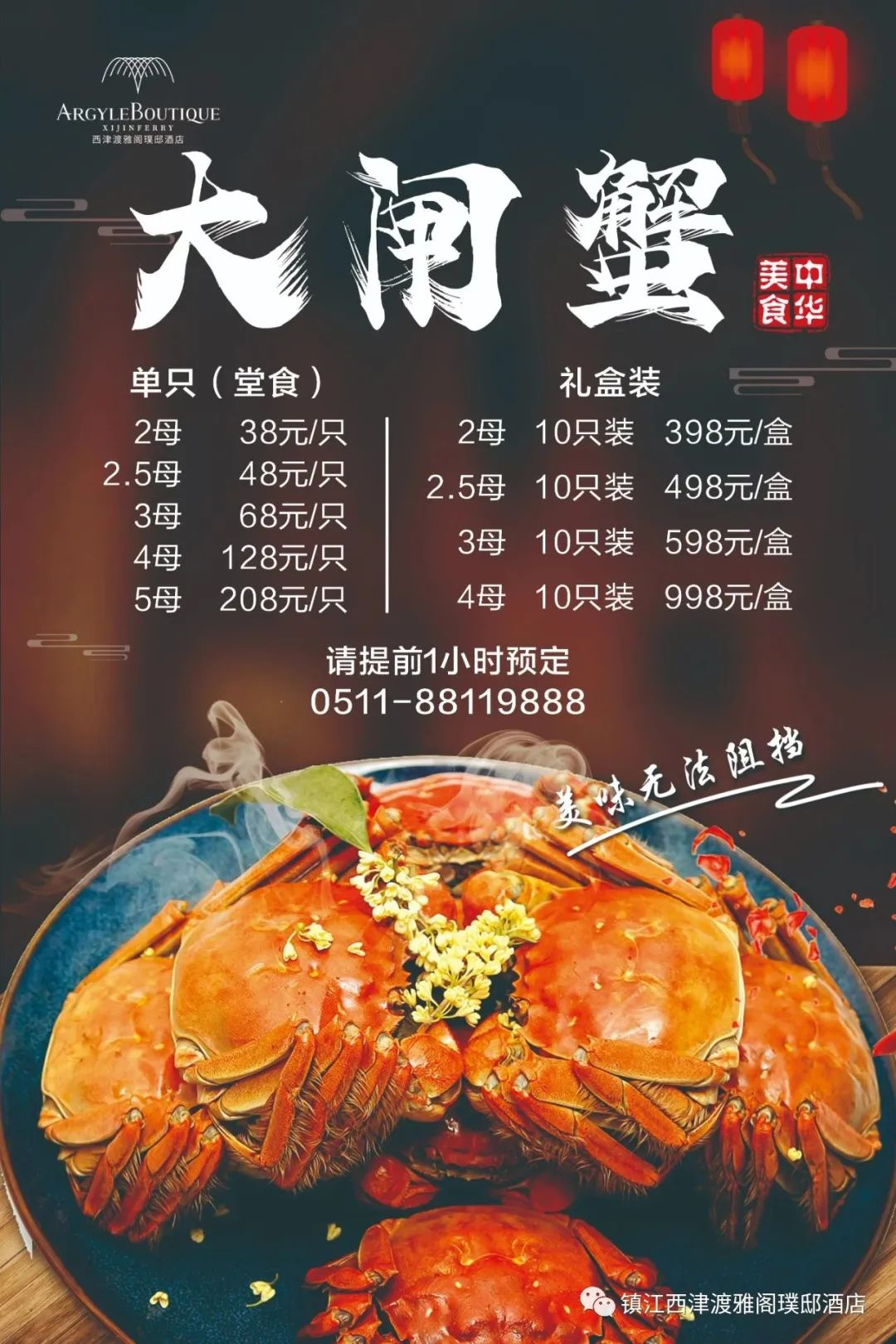 秋意阑珊,菊香蟹肥,正是品蟹好时节,欢迎来江苏镇江西津渡雅阁璞邸酒店(雅阁酒店集团旗下成员酒店)品尝。丰腴肥美的蟹黄,细腻甘甜的蟹肉,是这个季节不容错过的舌尖美味。一到秋天心里边就开始惦记着这口儿,背青、肚白、爪金的大闸蟹,只只个体肥大,肉质肥嫩饱满。