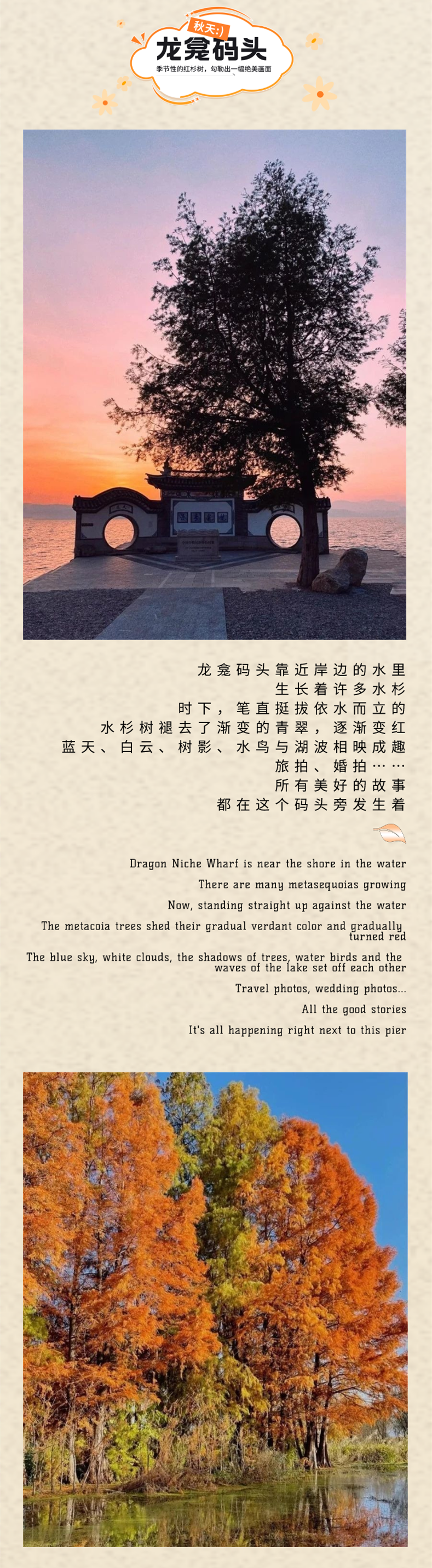 从大理星月湾雅阁璞邸酒店(雅阁酒店集团旗下成员酒店),特色景点推荐。龙龛码头靠近岸边的水里,生长着许多水杉时下,笔直挺拔依水而立的水杉树褪去了渐变的青翠,逐渐变红蓝天、白云、树影、水鸟与湖波相映成趣旅拍、婚拍……所有美好的故事都在这个码头旁发生着。