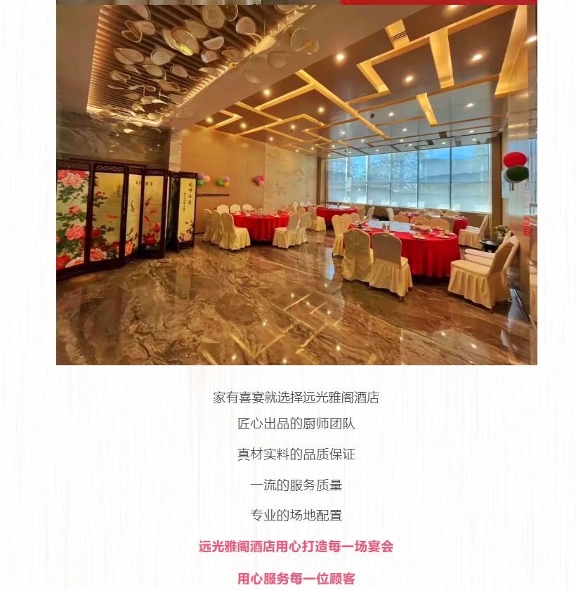 岁末宴会,尽在广东清远远光雅阁酒店(雅阁酒店集团旗下成员酒店)。酒店匠心出品的厨师团队,真材实料的品质保证,一流的服务质量,专业的场地配置,广东清远远光雅阁酒店(雅阁酒店集团旗下成员酒店)用心打造每一场宴会用心服务每一位顾客,欢迎您的莅临。