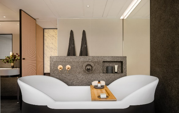 同时,酒店拥有497间客房,当中包括129间套房,室内设计采用天然橡木和花岗岩材料,通过宁静的设计,创造了一个室内宁静淡雅的氛围,与窗外繁华壮丽的维多利亚港景色形成了对比。卢志荣的设计旨在为宾客在酒店的不同空间中打造专属的「私享之境」,使宾客能置身其中,放松身心,倚卧在窗前躺椅,品尝精致的迎宾小食,品一口茗茶,沉淀一整天的思绪,静谧心神;或于绿洲浴室体验细意策划的日夜变幻及沐浴仪式,欣赏明信片般、壮丽维多利亚港的「如画景致」,踏上一场灵感之旅。