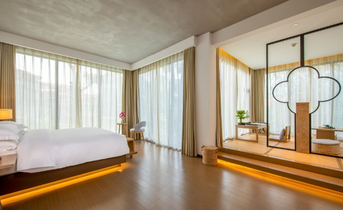 酒店设计为现代岭南园林建筑风格,依山傍水,亲近自然。