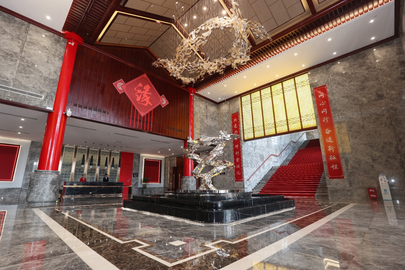 步入宾馆大厅,大片带有城墙肌理感的背景墙映入眼帘,空间由天然大理石和红色廊柱划分,隔栏里光影投射,有着精巧雅致的视觉效果,呈现出吴文化与高沟酒乡相恰的俊秀气息。