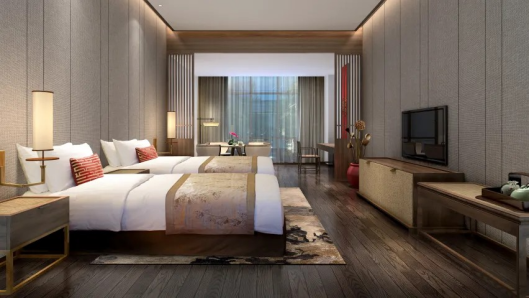 该宾馆共有288间新中式客房,可满足450人休闲度假、商旅出行的住宿需求。客房内置书籍、茶叶等文人书房必备物件,营造出一处简约典雅的新中式起居空间,给予客人精致惬意的居住体验。