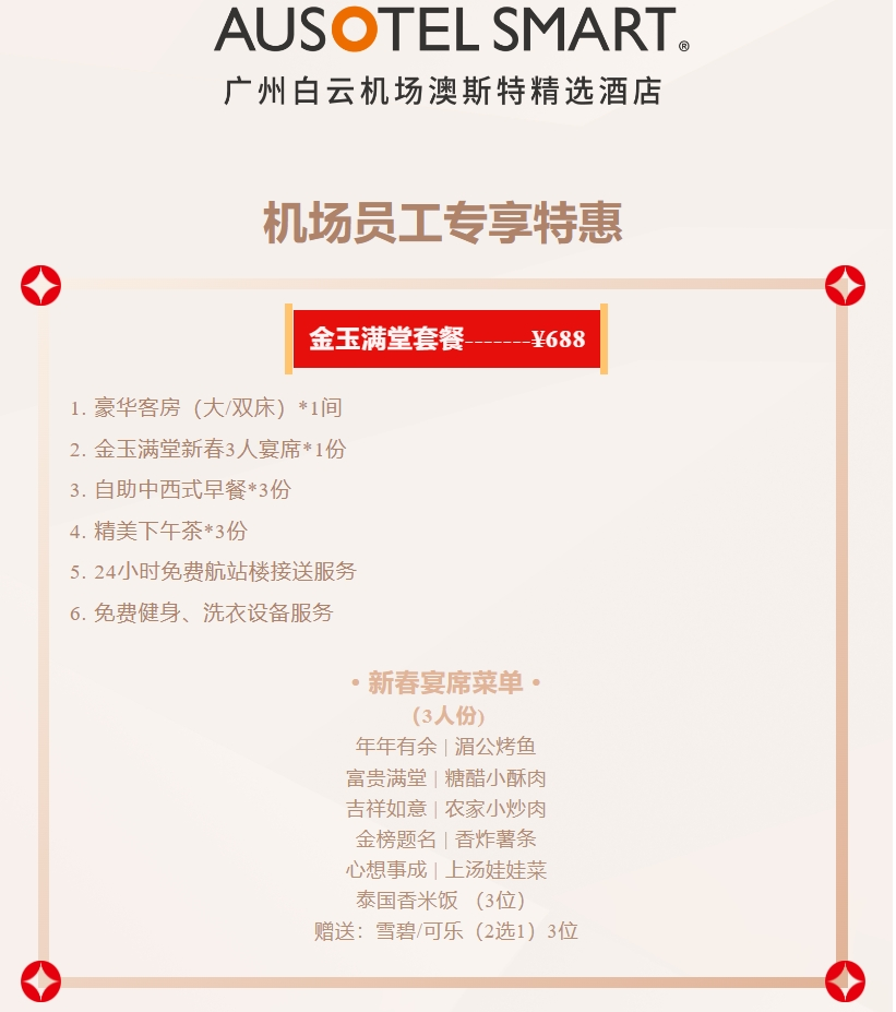 广州白云机场澳斯特精选酒店,雅阁酒店集团(澳大利亚)旗下成员酒店,机场员工限定,新春宴席套餐仅需688元,吃住全包,优惠活动不停歇。