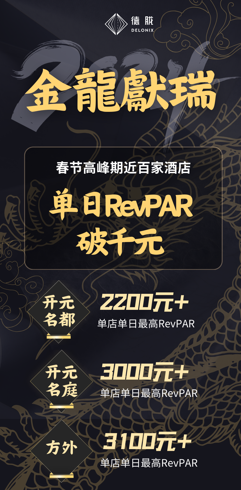 在刚刚过去的春节假期,德胧集团旗下超百家酒店单日RevPAR破千元,单店最高RevPAR达到3100元,开元名都、开元名庭、方外、观堂、颐居等多个品牌单店最高RevPAR也超过2000元,更有酒店2月满房13天,多家酒店连续满房6天以上。