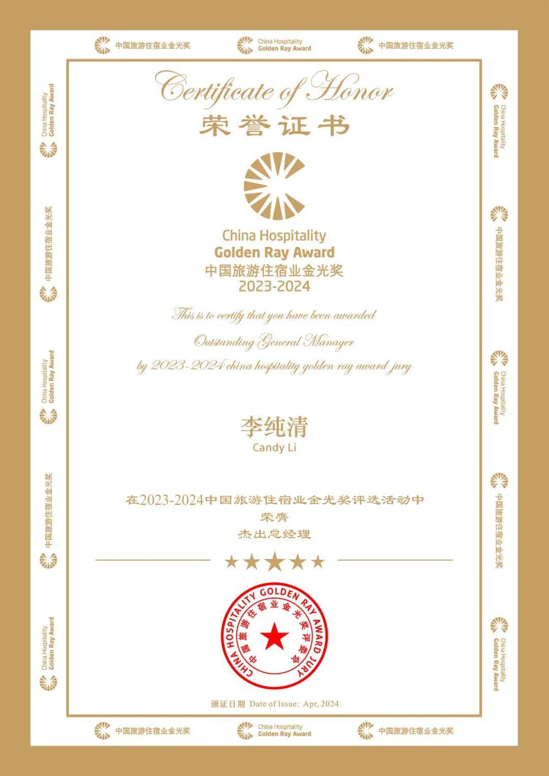 作为中国旅游住宿行业最为至高无上的荣誉—中国金光奖,是中国酒店行业跨业界、跨年度、覆盖面最广的奖项,获奖评选经过各学术、专业、跨界领域的评委根据客户评价、竞争力、住房率以及收益利润多个标准综合评选而出的最具行业典范的奖项。以其参选资格之严苛、入围酒店之著名、竞争程度之激烈堪称为旅游住宿业界的“奥斯卡”。代表着旅游住宿行业专家、全体从业者及消费市场对酒店综合实力考评的最高标准和至高认可。
