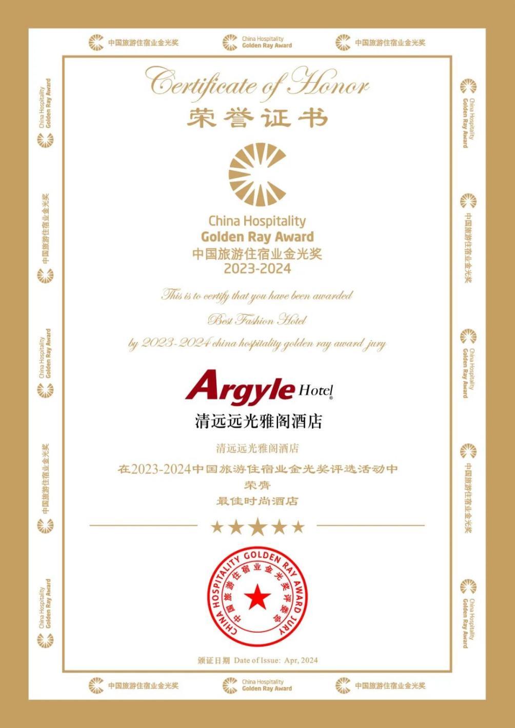 号外!号外!清远远光雅阁酒店(雅阁酒店集团旗下成员酒店)荣获 2023-2024 中国旅游住宿业金光奖““最佳时尚酒店”。总经理李纯清女士荣获“杰出总经理”。清远远光雅阁酒店此次能够获得这一殊荣,充分证明了其在酒店行业的卓越表现和优质服务得到广泛的认可。