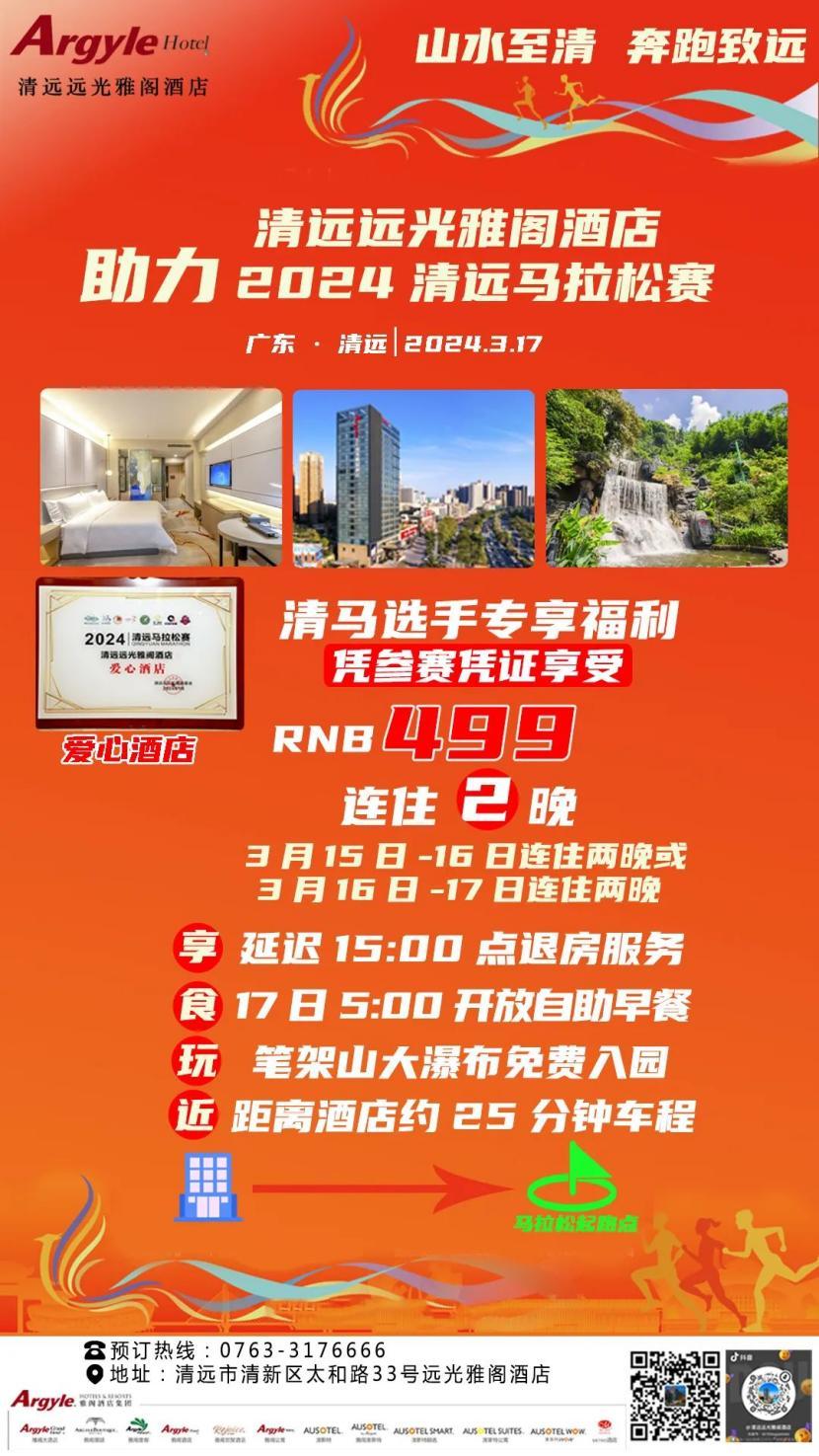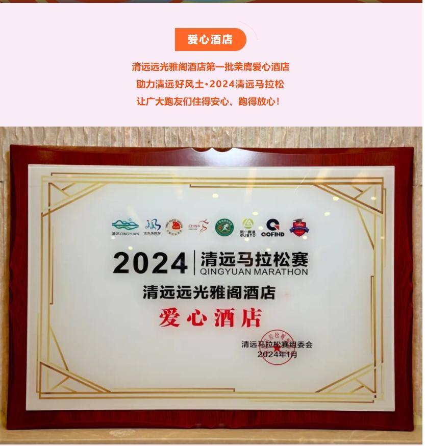 “山水至清 奔跑致远”清远好风土·2024清远马拉松将于3月17日上午7:30在清远体育馆北门鸣枪起跑。广东清远远光雅阁酒店(雅阁酒店集团旗下成员酒店)作为第一批荣膺爱心酒店,助力清远好风土·2024清远马拉松,让广大跑友们住得安心、跑得放心!